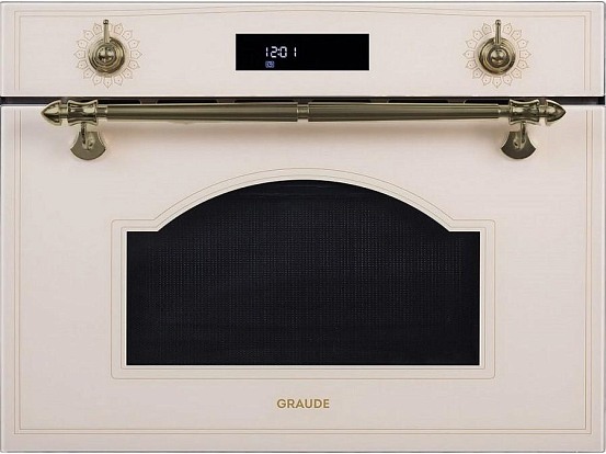 Микроволновая печь BWGK 45.0 с латунной фурнитурой. 8 режимов работы (включая гриль), управление поворотными переключателями и LCD-дисплеем. Защита от детей.