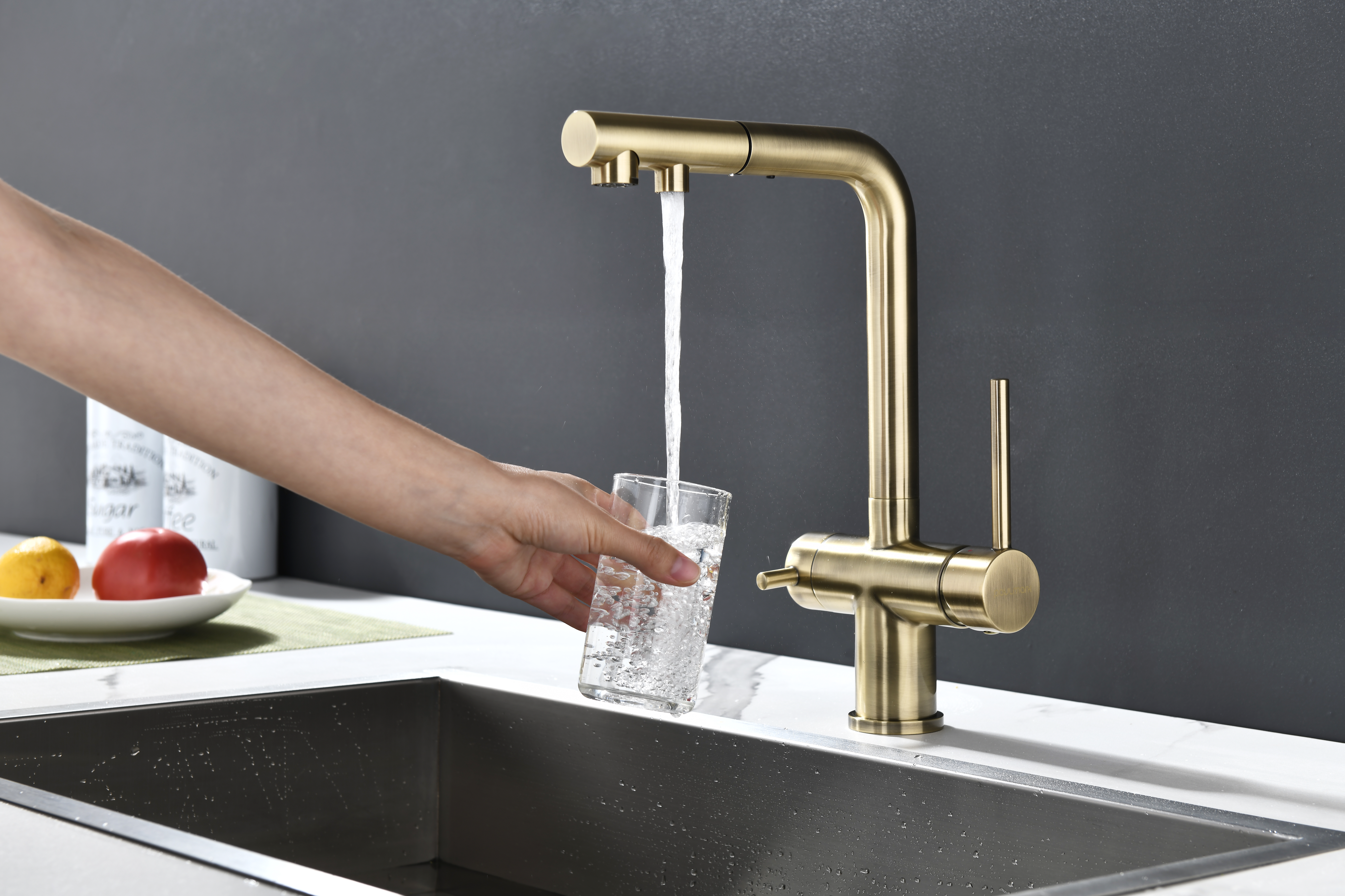 SERPENTINE оснащён функцией TRINKWASSER - излив смесителя имеет встроенный независимый канал для питьевой воды из фильтра, таким образом питьевая и водопроводная вода не смешиваются. Управление питьевой водой осуществляется отдельным рычагом, расположенным слева. Для пуска водопроводной воды используется большой рычаг справа.