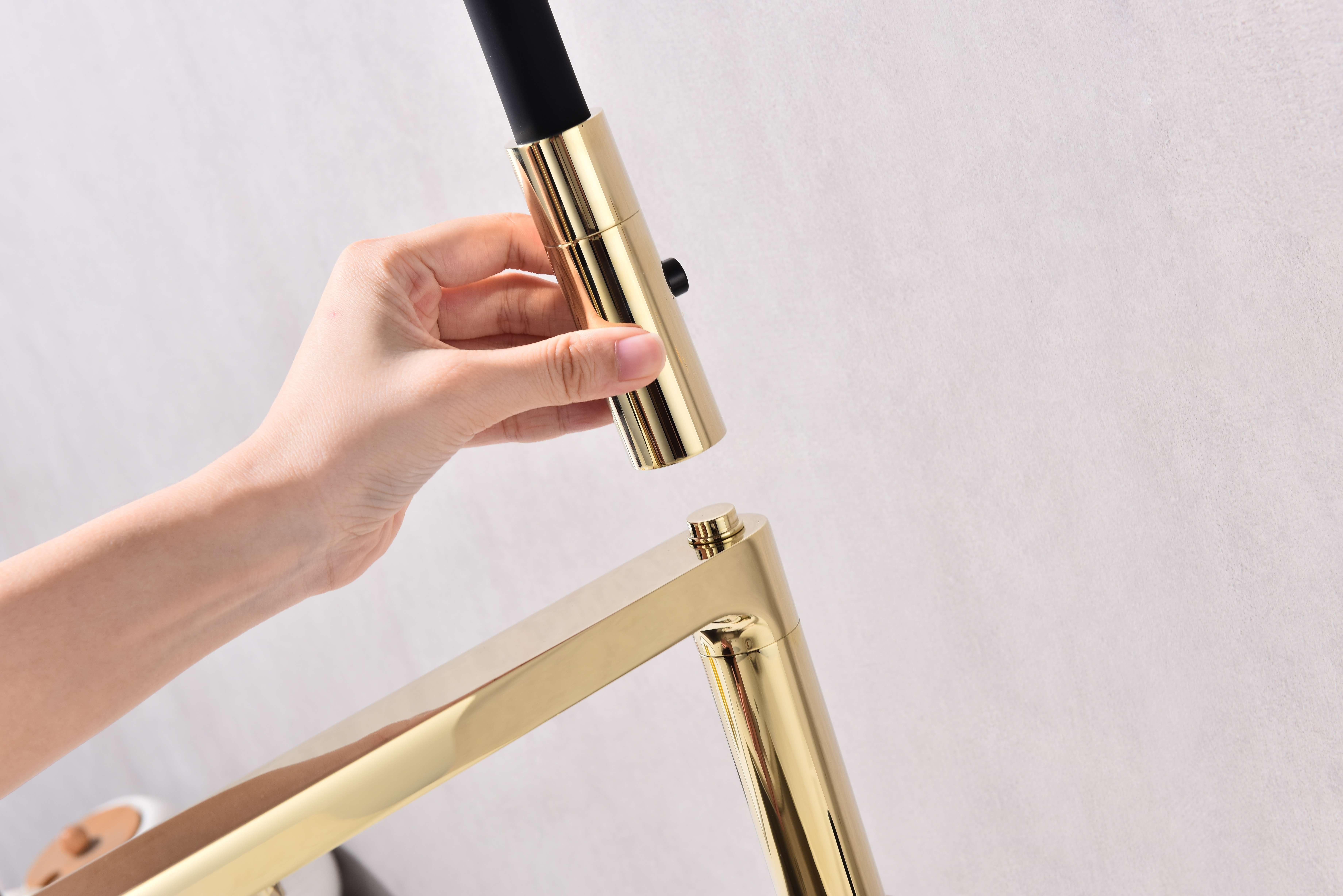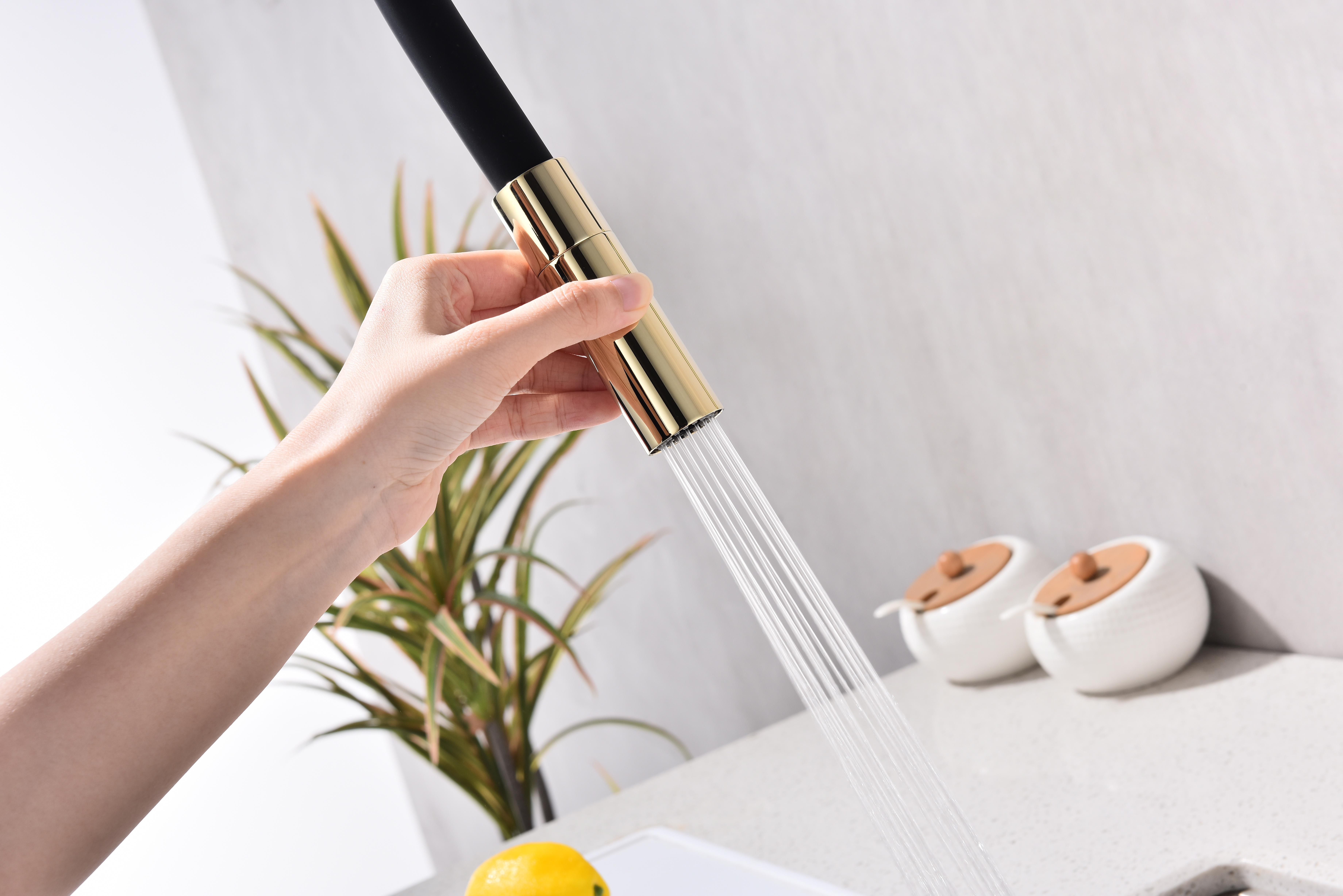 Гибкий силиконовый излив оснащен функцией деликатного душа и магнитным механизмом фиксации в задней части латунного корпуса. Он позволяет ополоснуть посуду или мойку в любой ее части или наполнить емкости даже на столе рядом с мойкой.